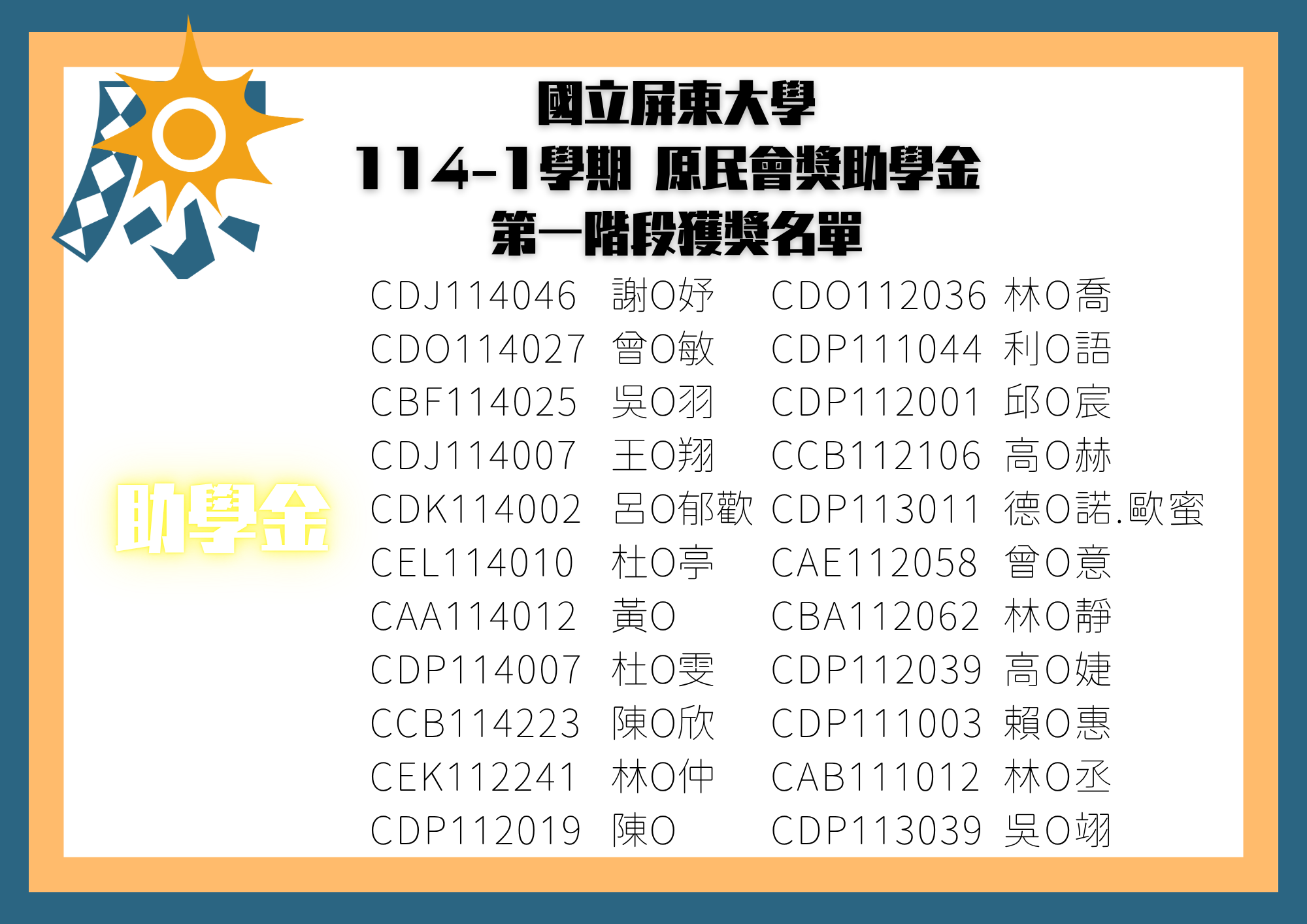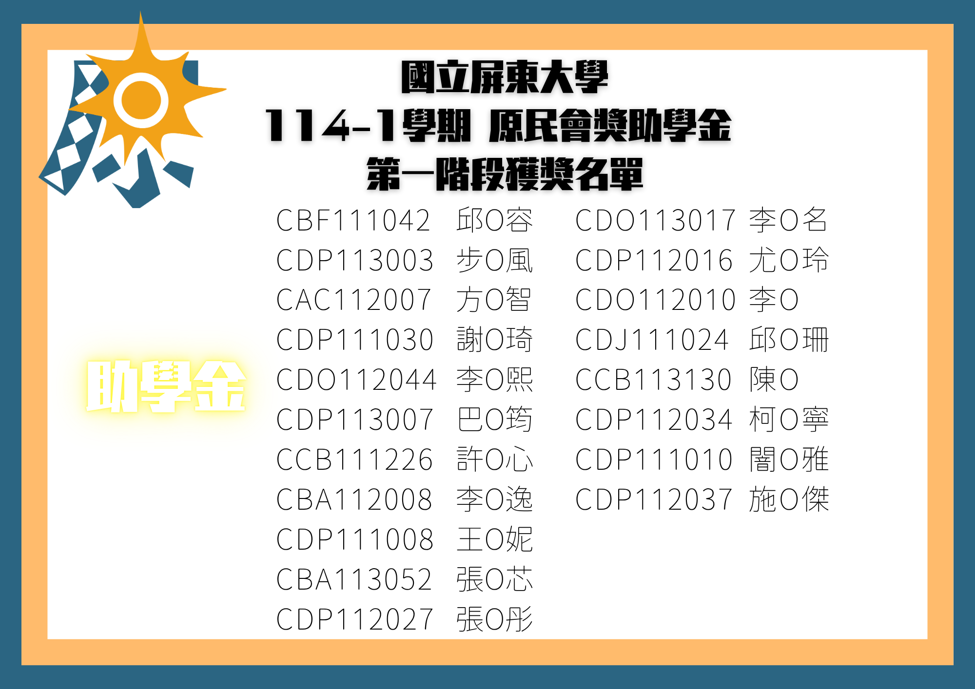 【公告】114-1原民會獎助學金第一階段獲獎名單