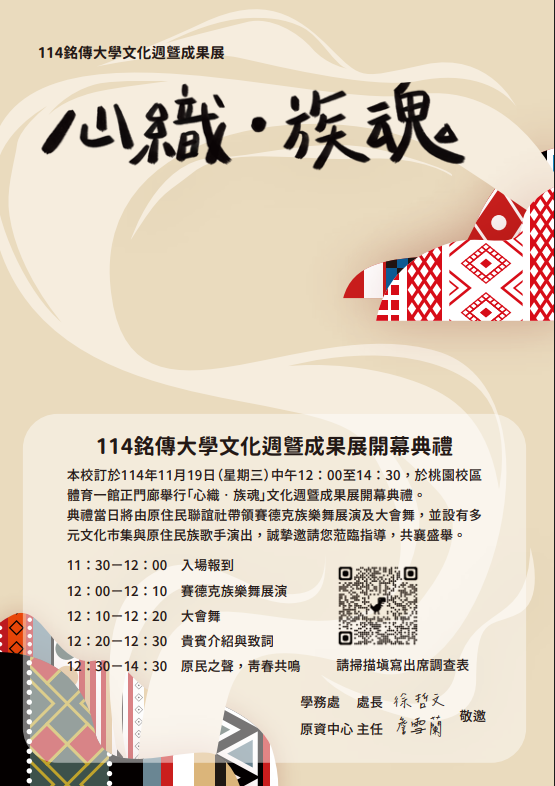【轉知】銘傳大學原資辦理「114學年度『心織 ‧族魂』文化週暨成果展開幕儀式」