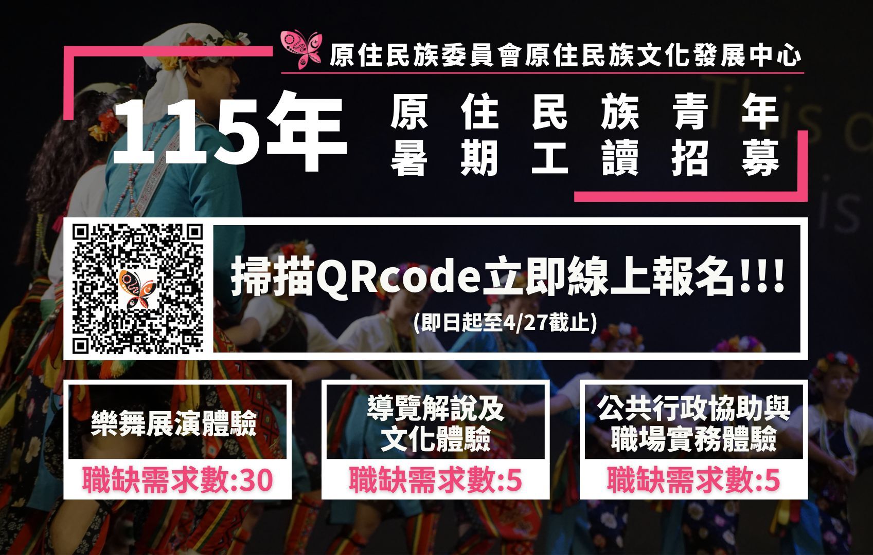 為協助原住民族青年在學期間提早接觸文化工作實務,培養職場基礎能力,以「臺灣原住民族文化園區」為駐點場域,結合樂舞展演與文化推廣工作,提供青年實際參與原住民族文化現場的學習機會,工讀內容分為下列三大領域,將進用40名工讀生,自即日起開始報名至4月27日止!敬請原民學子把握機會!