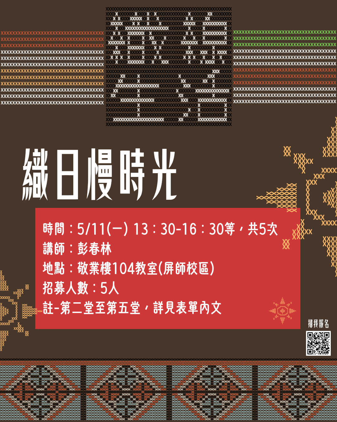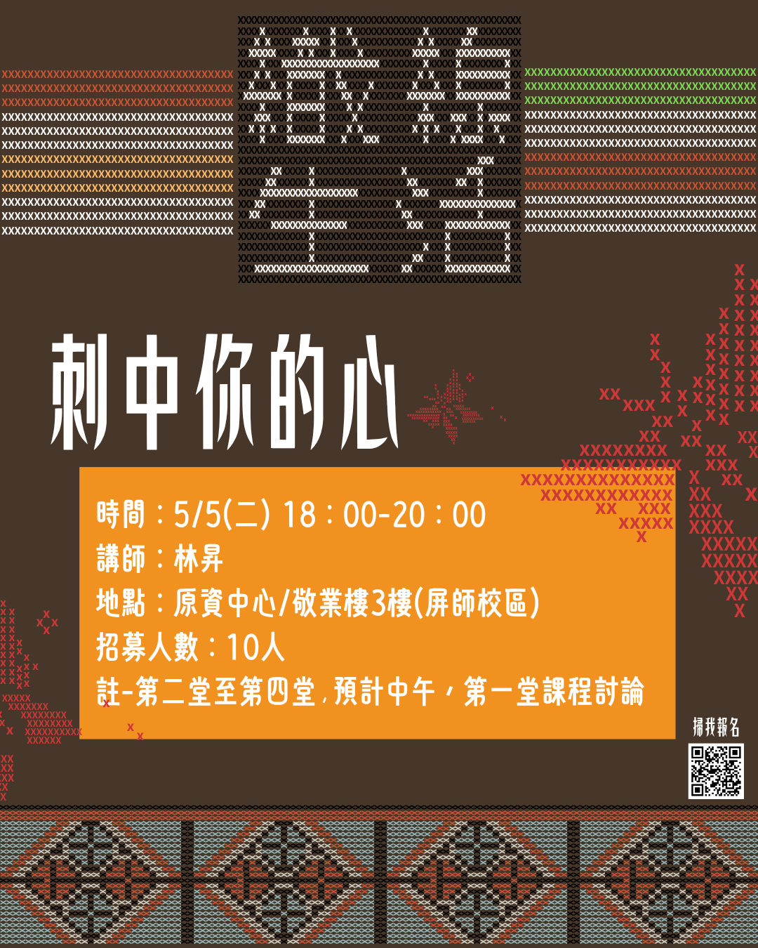透過文化講解與實作體驗,帶您深入認識織布與刺繡的傳統工藝之美,並於後續成果展中展現學習成果。